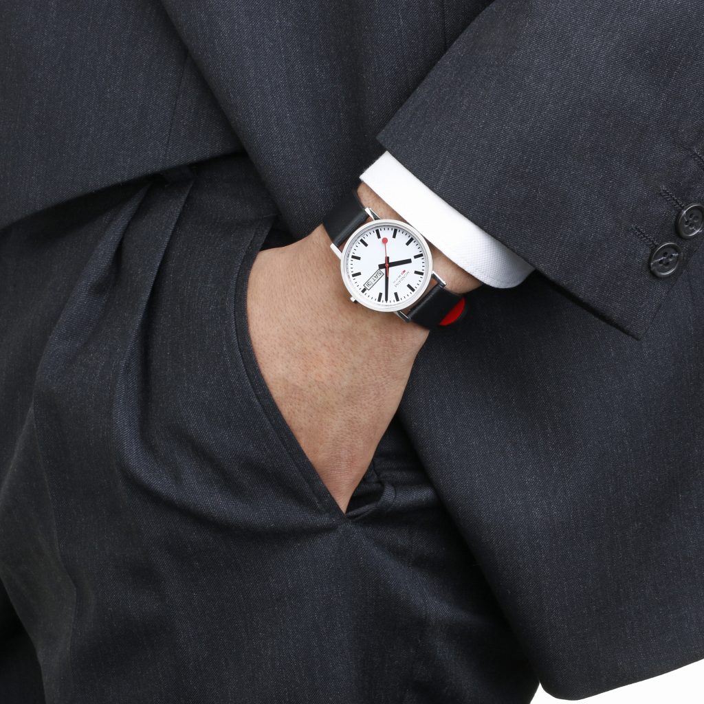 Die pure Essenz der Schweizer Bahnhofsuhr – klar, präzise und zeitlos am Handgelenk.
